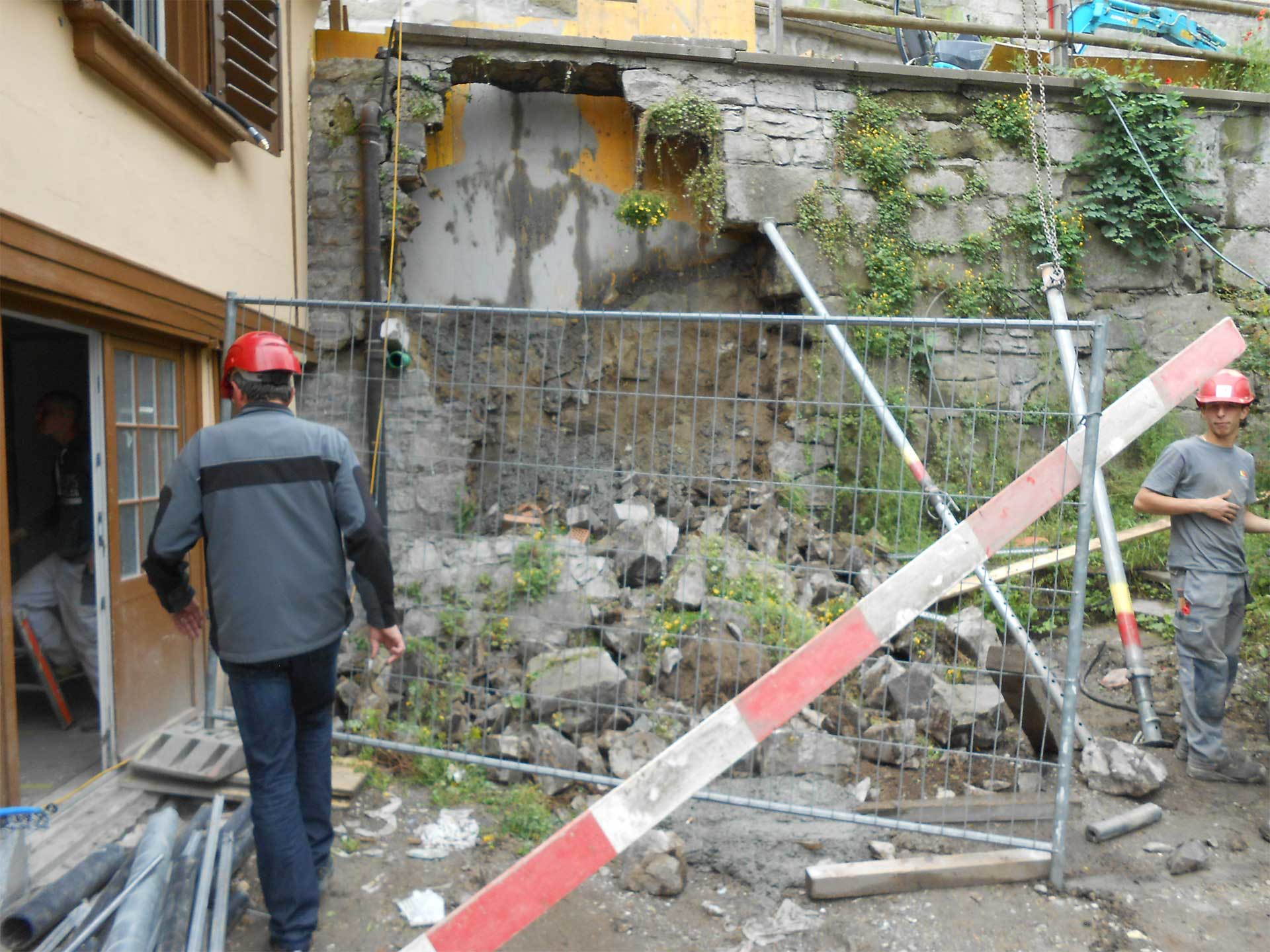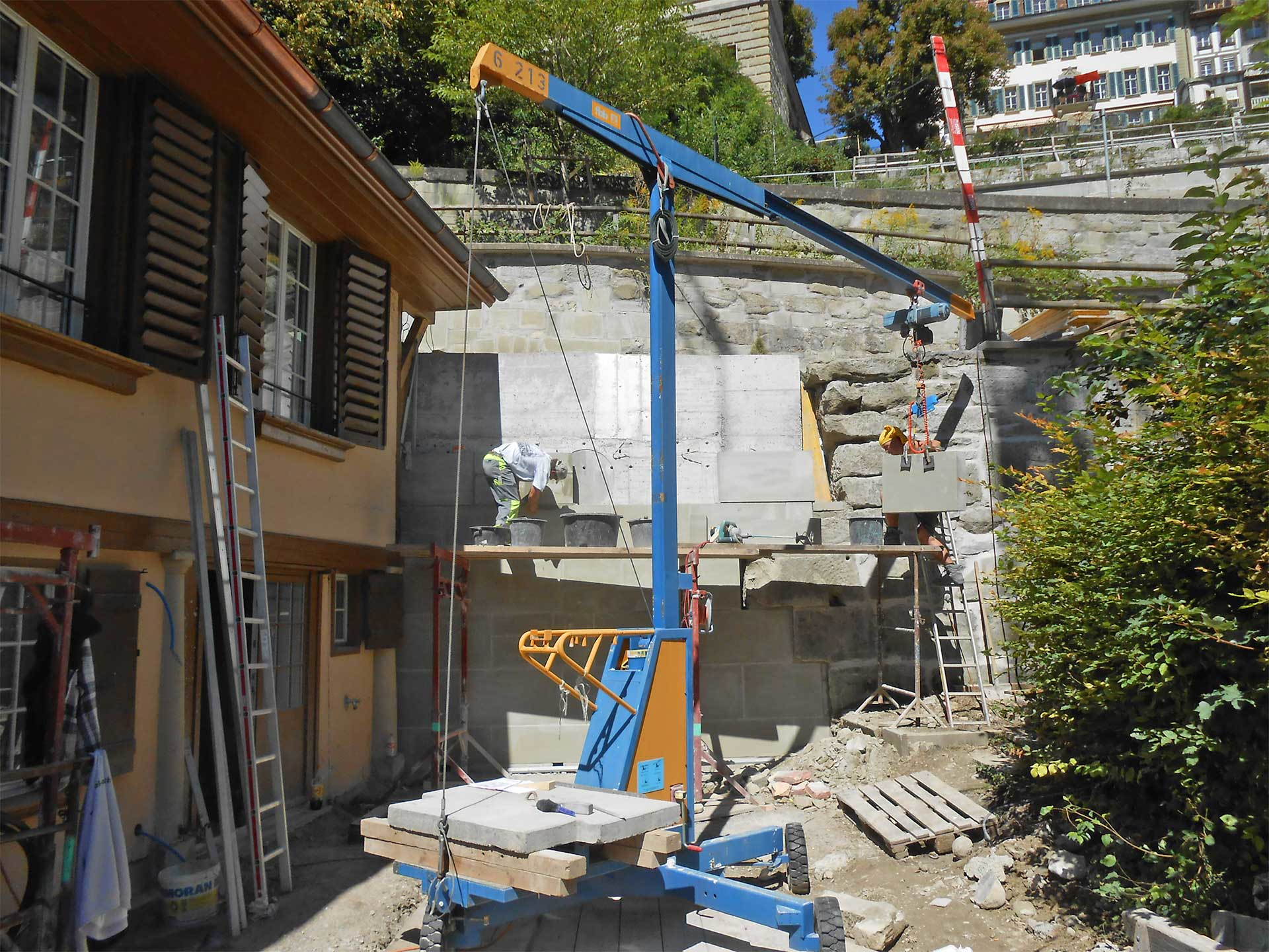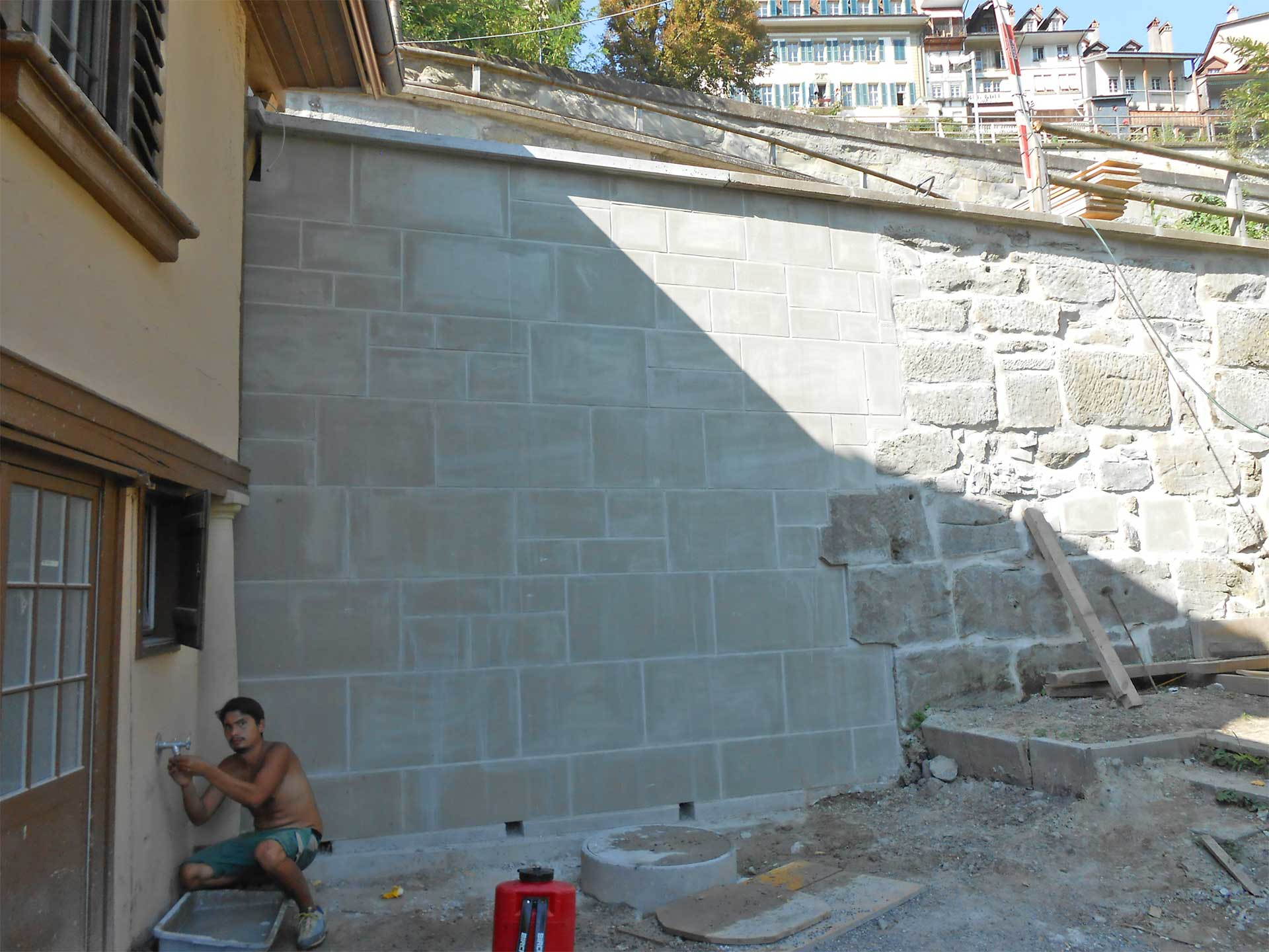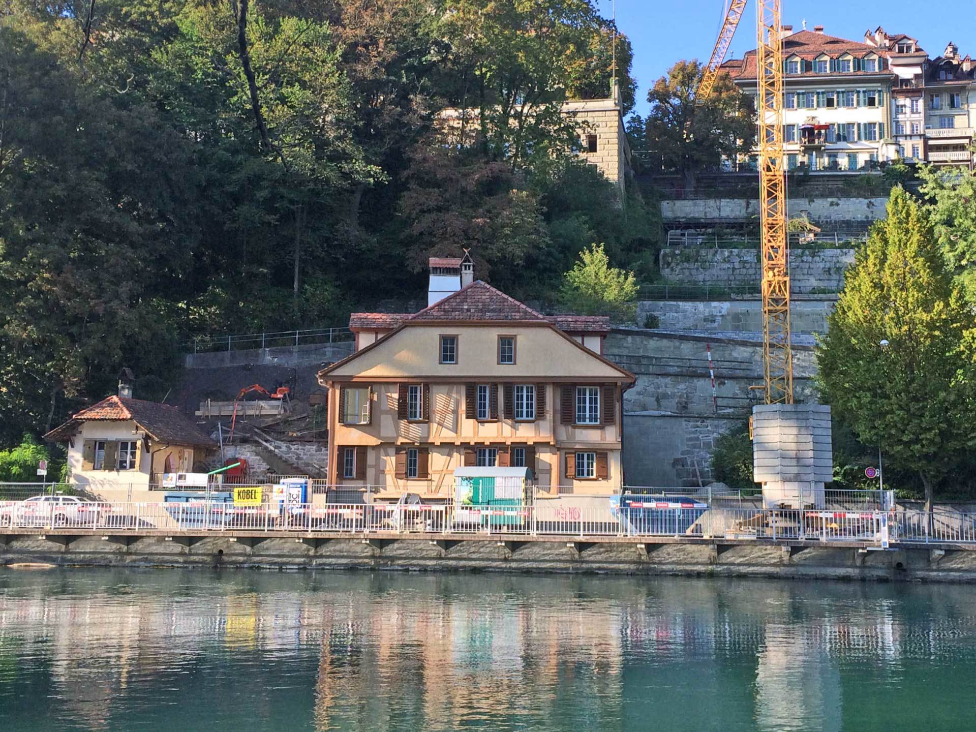 Der Aarehang wies vor der Sanierung zahlreiche Auswaschungen auf, Teile der Mauer drohten sogar abzurutschen. Deshalb mussten zuerst die erodierten Mauerreste und Teile des Hangs abgebaut werden. Um die Statik von Hang und Mauer zu stabilisieren, wurde danach eine Entwässerung und eine Betonmauer mit einer Hinterfüllung gebaut. Um das historische Stadtbild zu erhalten, wurde vor dieser Stützkonstruktion ein massives Fassadenmauerwerk aus dem für Bern typischen grünen Sandstein hochgezogen. Das Spezielle an diesem Bauwerk sind die unterschiedlichen Materialien, bei denen je ihre eigenen Eigenschaften berücksichtigt werden mussten. Der Beton wurde zur Konservierung gegen Wasser abgedichtet, der Sandstein im Gegensatz dazu gerade nicht, damit er «atmen» und die Feuchtigkeit entweichen kann.