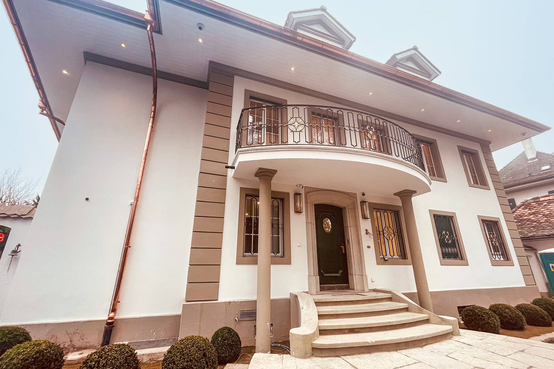 Die Villa wurde nach heutigen Energiestandards auf qualitativ hohem Niveau saniert und aufgestockt. Das Dach wurde zu einem Sparrendach umfunktioniert, um noch mehr Raum und Licht zu schaffen. Die umliegenden Bauteile, wie etwa der Balkon im Eingangsbereich, stechen mit ihren runden Formen und Abschlüssen ins Auge und machen den Eingang und das Haus zu einem ästhetischen Highlight.